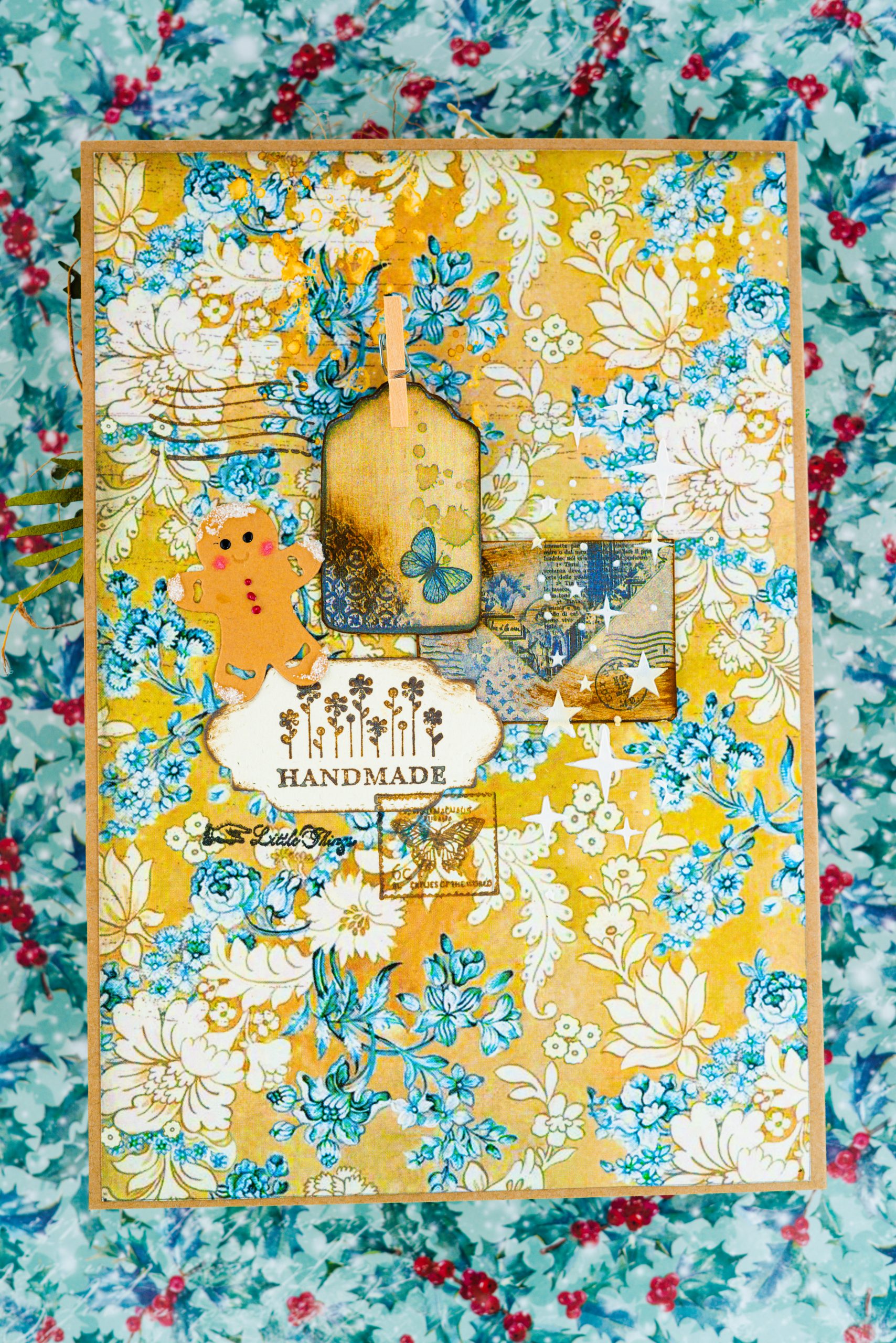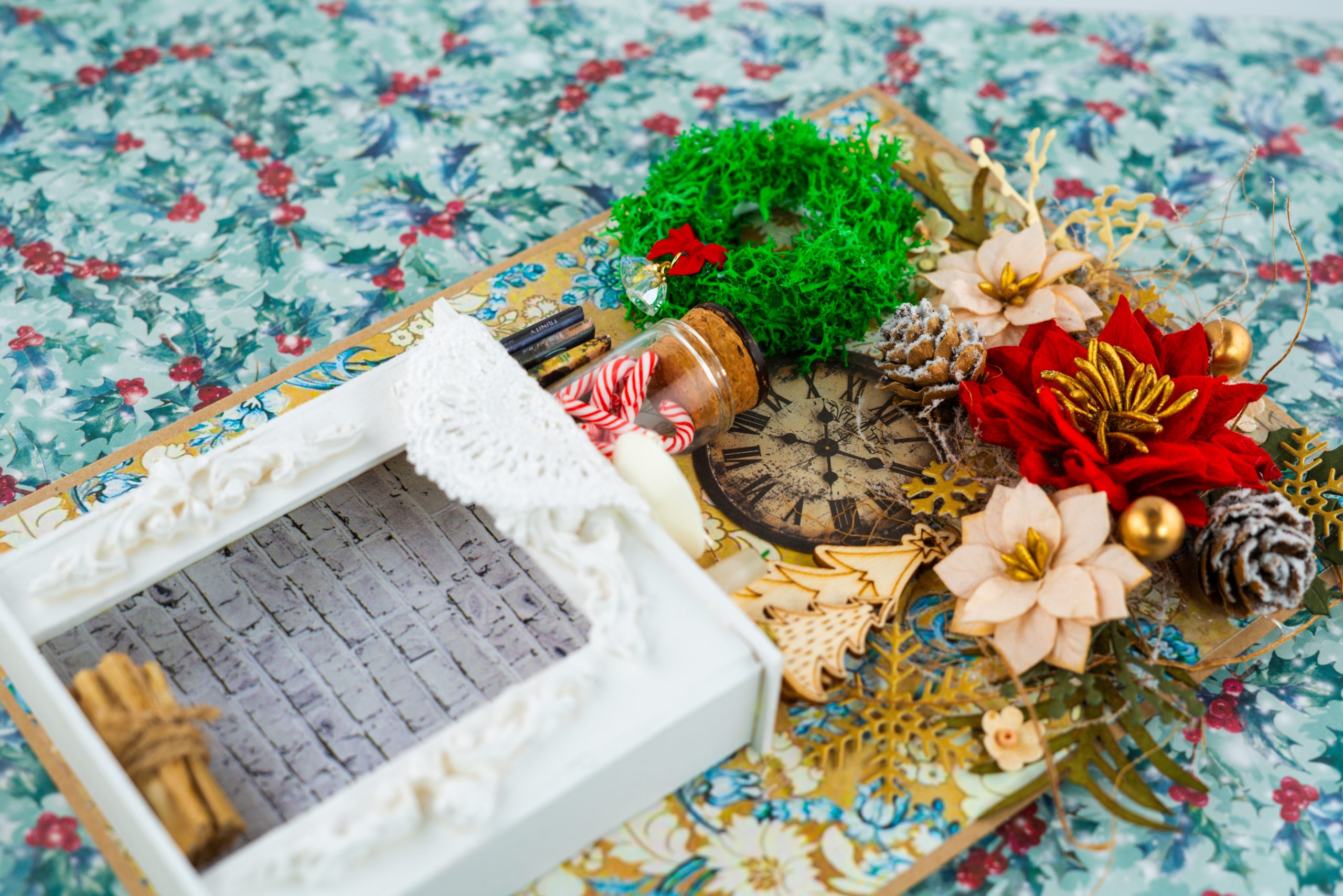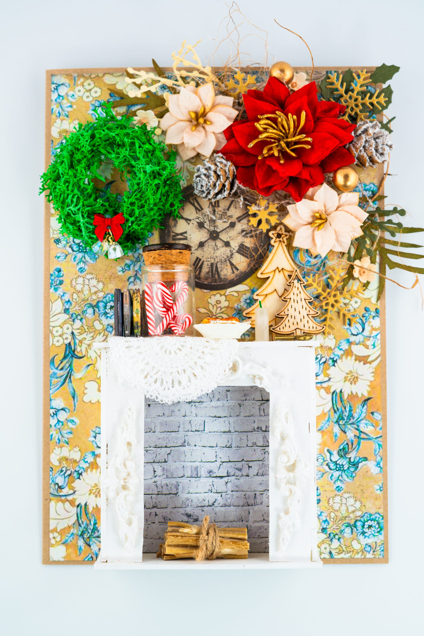 Celebrate the magic of the holiday season with our meticulously handcrafted holiday cards. The centerpiece features a small, ornate fireplace with a realistic brick background, surrounded by decorative elements like a green moss wreath with a red ribbon, vibrant red and beige poinsettias, and delicate golden accents. A miniature jar of candy canes adds a whimsical touch, along with wooden Christmas trees, snowflakes, and pinecones, creating a cozy, nostalgic winter scene. The floral wallpaper background enhances the vintage charm of this meticulously designed card, making it a unique and thoughtful holiday keepsake.